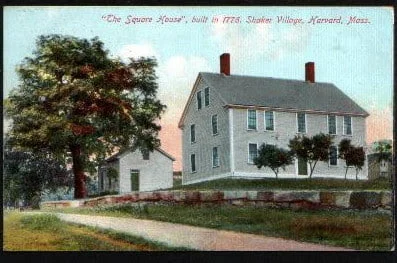 The Square House where Ann Lee stayed in Harvard, now a private home in Shaker Village. This postcard has the wrong date for the Square House, which was actually built for Shadrach Ireland around 1769, before Ann Lee came to Harvard. A postcard from the HHS archives.