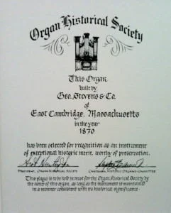 The citation is awarded by the Historic Organs Citations Committee of the Organ Historical Society to publicly honor pipe organs that possess special historical qualities. As stated above, our organ is one of only three organs built by a George Stevens company to receive this honor.