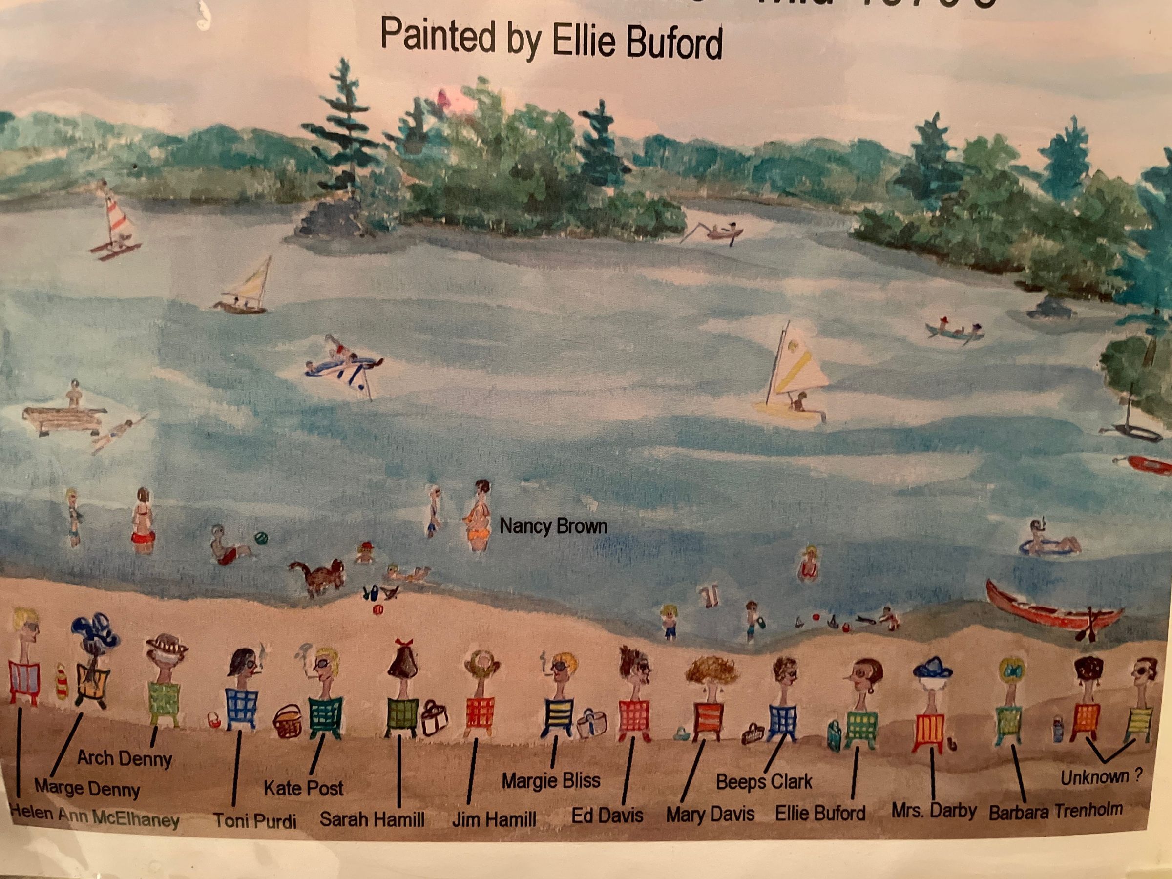 "The Beach Bums of Harvard", framed watercolor, by Ellie Buford. 1975A long line of friends gathered to enjoy the sun and peaceful views arose “The Pond”. Many wonderful, but subdued cocktail hours were spent watching the sun set while enjoying “iced tea” as the children and spouses delighted in swimming and sailing. The friends were, and still are king time residents, known as “The Beach Bums” of Harvard.