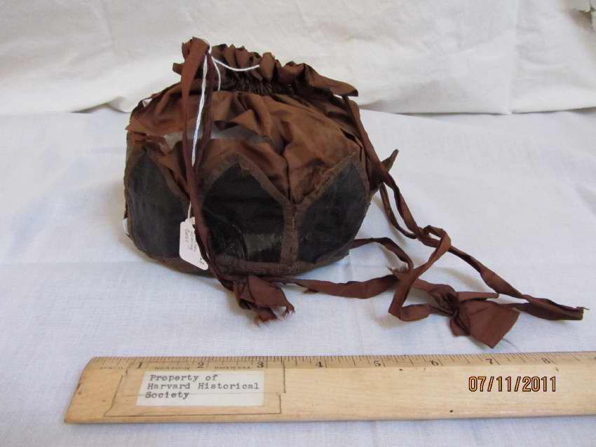 Go back Prev Next Sewing Case Object/ArtifactDescriptionShaker Sewing drawstring pouch --base is German Leather, top is brown silk fabric. Base measures 4.5 x 4.5, overall height approx 5 inches. Base has 8 shield shaped petals forming the bottom of the pouch. Closed at top with drawstring.