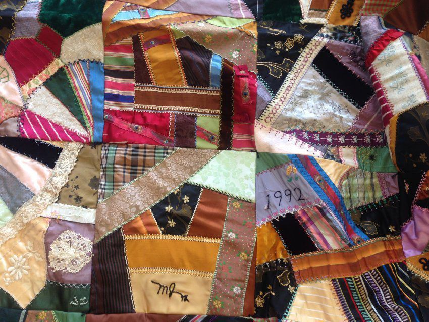 Crazy quilt mad by Harvard Historical Society.Twenty squares, many initailed or signed: Betty Humphries, EMH, VL/VCL (Virginia Corey Lee), Sharon Naismith, PE, MTL (MLT?), MJ. Dated 1992. Mentioned in July 8,1992 minutes of HHS, and Spring HHS Newsletter. Black binding. Excellent condition, with small tears on two squares. Tan backing.