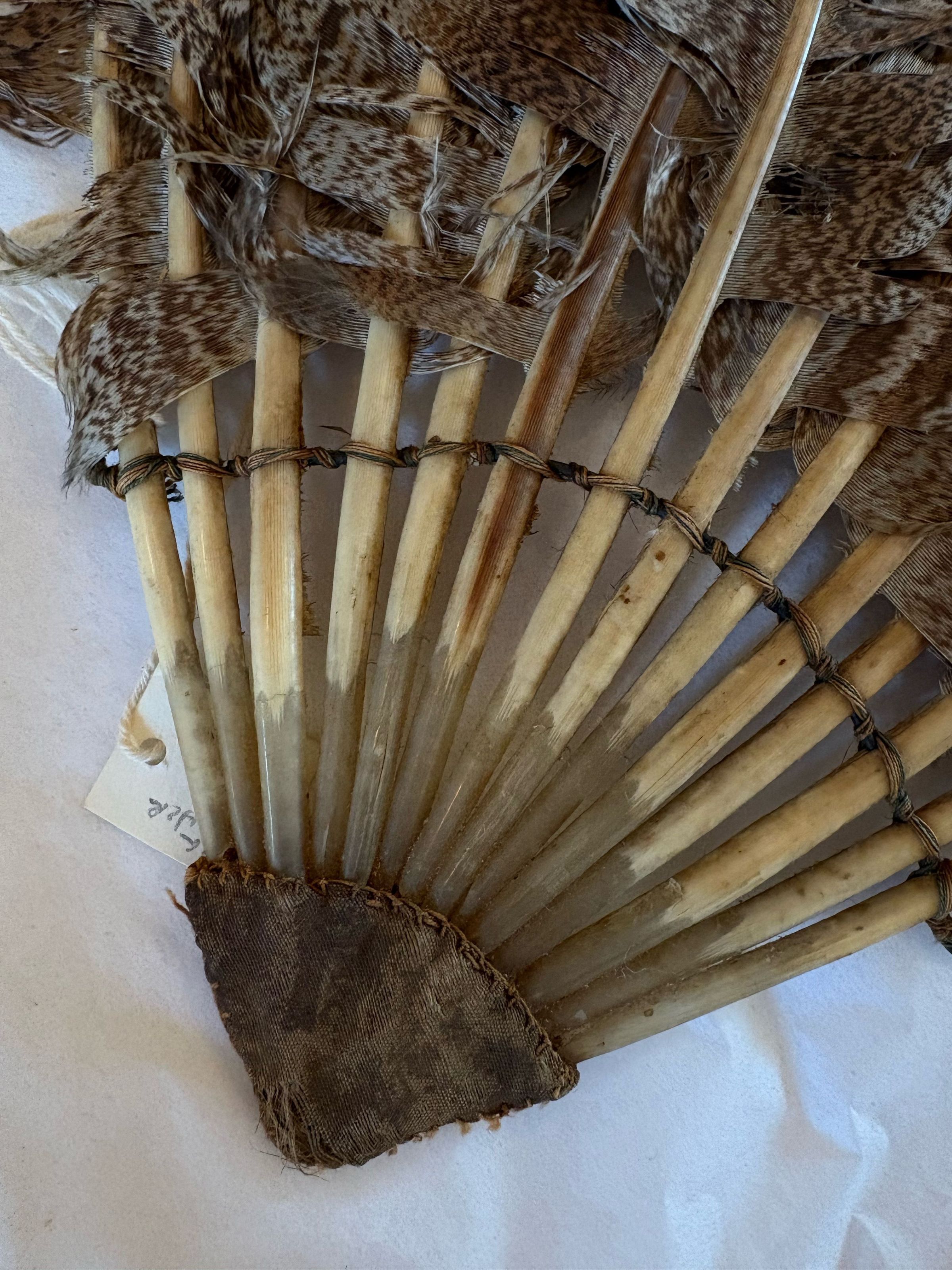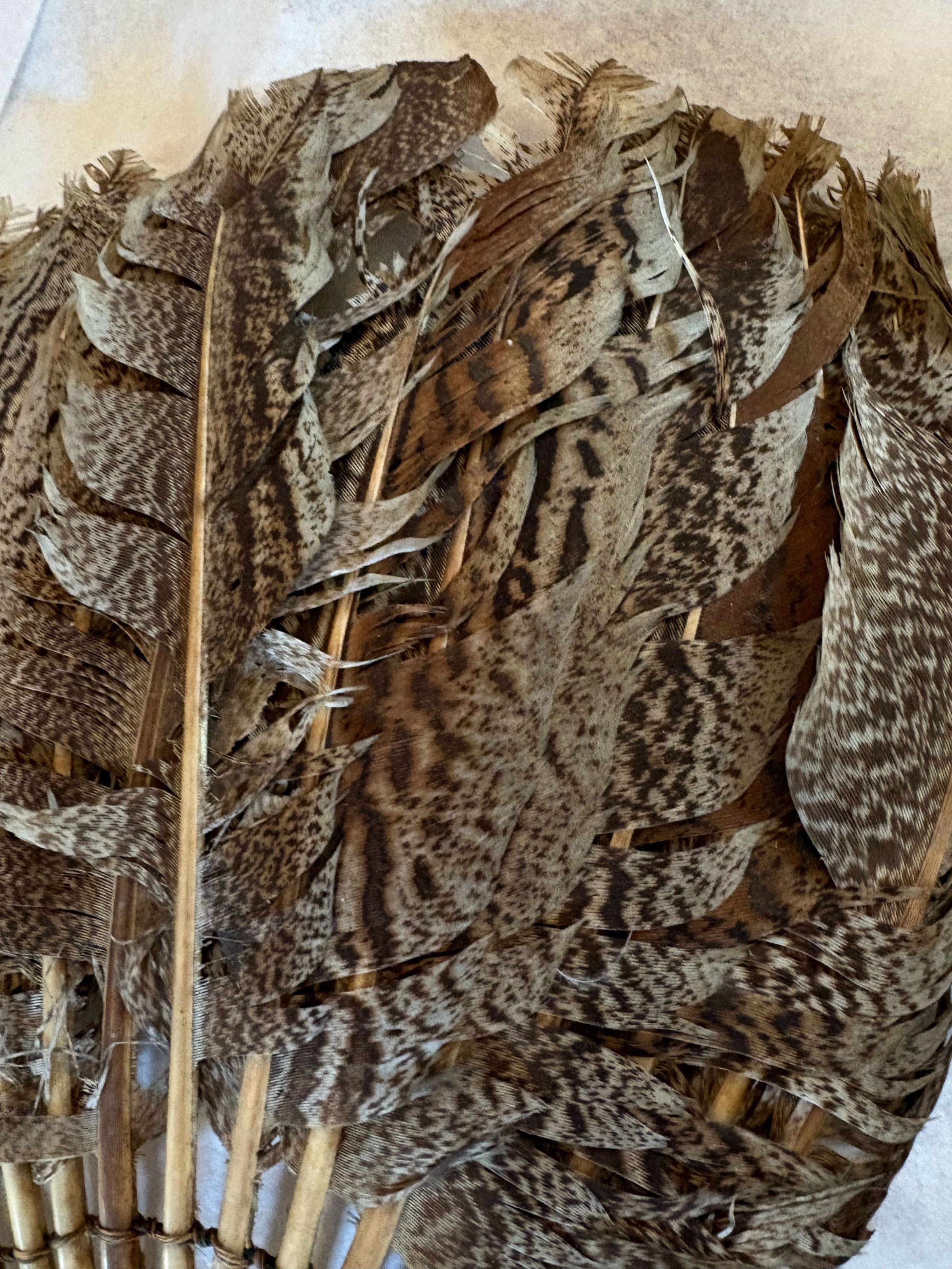 Go back Prev Next Fan Object/ArtifactDescriptionFourteen turkey feathers from wings; wired and woven 3.25" from base; stabilized at base with worn velvet; velvet hand whipped on. Shaker.