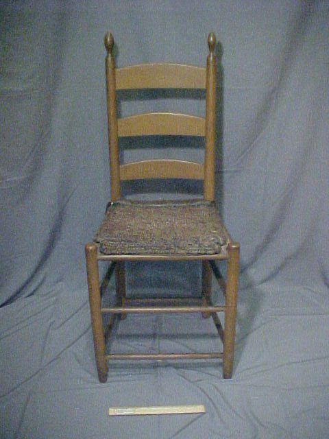 Go back Prev Next Chair Object/ArtifactDescriptionChair: height of front rail: 19.25"; ladder back chair; three graduated arch top slats; cane seat and carpet cushion; elongated flame finials; tilters on rear legs. Shaker.See seat cushion: H.0000.30